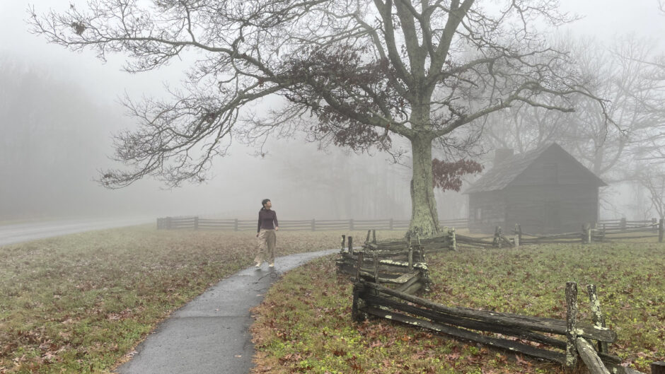 We ate sandwiches purchased back in Meadows of Dan in the car, watching the fog blow quickly down the slopes and out over what would have been the sweeping vistas of the central Virginia mountains.
